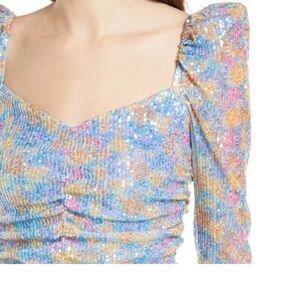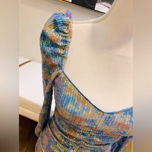 This stunning Saylor Lawrence sequin pastel multicolor ruched dress is perfect for cocktail parties and special occasions. fully lined, and in excellent condition. size XS