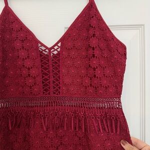 Saylor red fringe dress, Saylor Margot cocktail dress, red lace midi dress, wedding guest dress medium, fringe hem party dress, crochet cut-out red dress, Saylor dress Revolve, romantic lace dress, boho luxe dress, preppy chic style, date night dress, holiday party dress, statement fringe dress, festival ready dress, lace bodycon midi, special occasion dress, semi-formal lace dress, bridesmaid alternative dress, red crochet detail dress, formal event dress