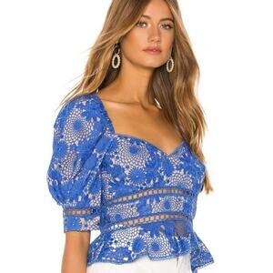 Romantic and effortlessly chic, Saylor Marnie blouse is the perfect addition to your wardrobe, in a beautiful "Cornflower" blue, this top features intricate white floral embroidery and delicate lace details that give it a vintage-inspired charm. The elegant ruffled accents along the sleeves and neckline add a touch of playful femininity.