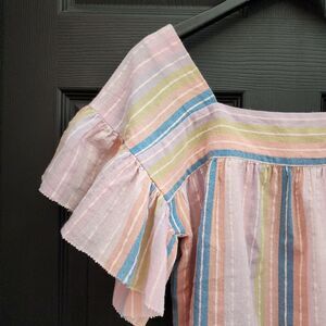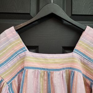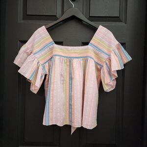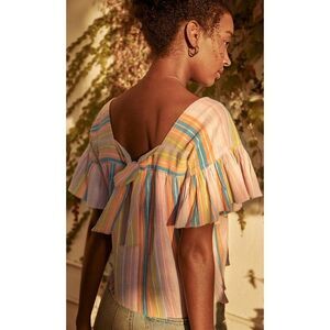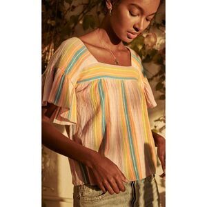 One of our favorite go-to breezy tops, back in a sherbet striped cotton. Easy, square neck blouse with back bodice tie and pretty picot hem detailing.