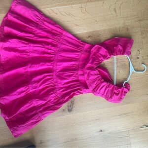 Bright pink dress with ruffled sleeves and tiered design. Perfect for a bold statement.