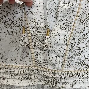 This product is a white peasant blouse with a V-neckline and flutter sleeves. It has a tie closure and is adorned with tiered ruffles and a green accent. The brand is Saylor and it is a regular fit in size medium. The blouse has a boho style and is made of gauze material.