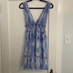 A gorgeous blue and white abstract printed crepe dress from Saylor.