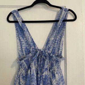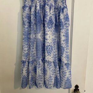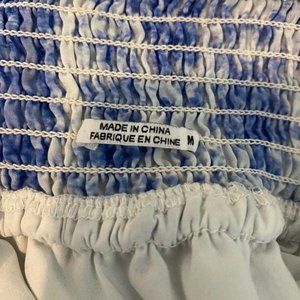 Skirt is lined with white fabric. Straps are adjustable and can be tied to fit (both crossed and not). Smocked/ruched elastic at the waist. Perfect for a spring or summer event or any wedding or bridal shower/parties!