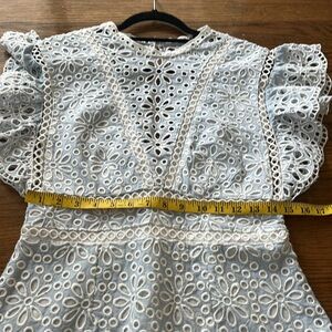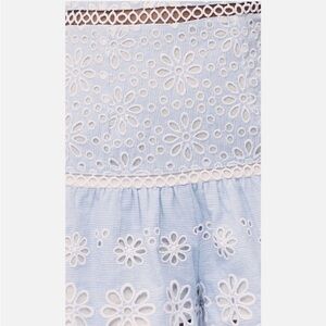 Highlighted with eyelet embroidery, this crisp cotton romper has pinstripe detailing. It is styled with playful flutter sleeves and scalloped edges.