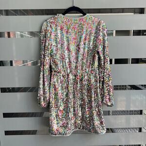 Saylor 'Val' multicolor sequin wrap mini dress. Fully sequined with a V neckline and a wrap style with button fasten. Long sleeves. Fully lined. *Missing silver tie waist belt* Otherwise in great condition. Size XS - 14.5" waist; 32" length; 24" sleeves.