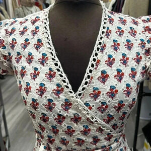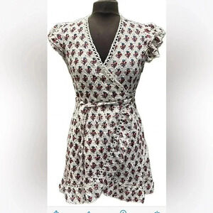 Beautiful Saylor floral wrap dress featuring flutter sleeves and delicate lace trim along the neckline and hem. This feminine, summer-ready piece is crafted from lightweight 100% cotton and has a flattering wrap silhouette.