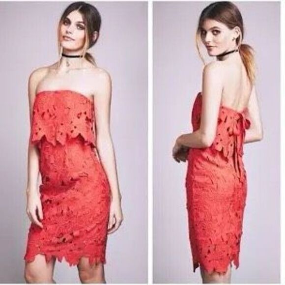 Saylor x Free People Erin Red Lace Strapless Knee Length Pretty Dress Coral Red
