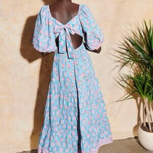 Saylor Annaleise Blue Dahlia Block Print Cotton Midi Dress Size M Boho Tie Back