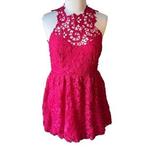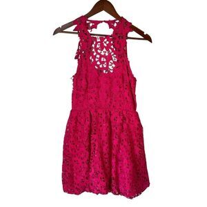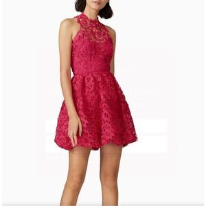 Saylor Deb Minidress, Medium. Backless, covered button closure at nape, high neckline. Allover hot pink lace, lined, bubbleskirt,sleeveless. Pockets!!! Feminine, girly. Back zip. There are spots on inner lining, cannot be seen. weddingguest #cocktails #dressy