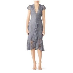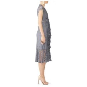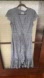 Silver floral lace (100% Polyester). Sheath with flared hemline. Cap sleeves. V-neckline. Hidden back zipper closure. Partially lined. 44" from shoulder to hemline. Imported.