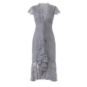 Silver floral lace (100% Polyester). Sheath with flared hemline. Cap sleeves. V-neckline. Hidden back zipper closure. Partially lined. 44" from shoulder to hemline. Imported.