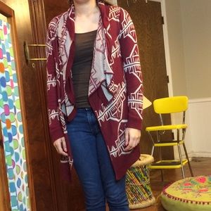 This maroon aztec knit cardigan is so cute and so comfortable to wear. The brand is Saywhat😋 the tag says its a small and it fits like a small