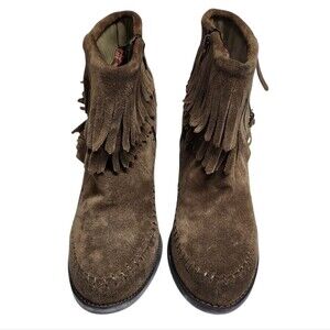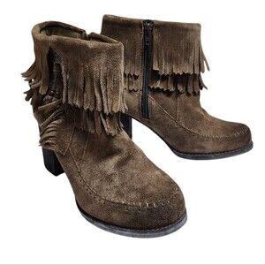 Sbicca Ankle Boots Women 8 Brown Suede Fringe Side Zip Block Heel Western Boho