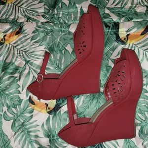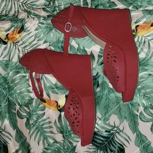 8.5 medium wedges, "Kerrina" style laser cut out details open toe with ankle strap. Deep red burgundy color