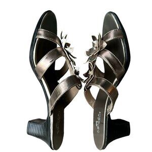Elevate your style with these stunning Sbicca of California Goldie metallic strappy sandals. The floral design adds a touch of elegance perfect for any occasion, whether it be a wedding, party, or casual business event. The slip-on style and mid-height block heel provide both comfort and style, while the faux leather upper material and insulated features ensure durability and longevity. These Sbicca open toe sandals are available in women's size 7W and are perfect for any fashion-forward woman looking to add a touch of metal to her wardrobe. In good pre owned clean condition, flowers and accents intact, minor use wear. Please review pictures for more details, thank you.
