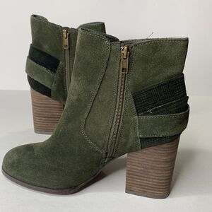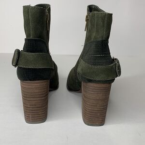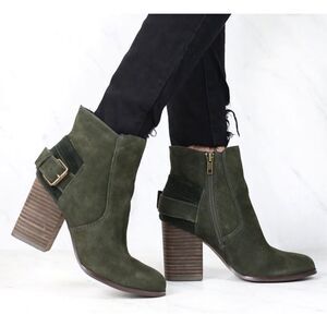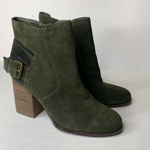 These Sbicca forest green suede ankle booties are perfect for fall, featuring block heel and cushioned insole, and rubber sole with nonskid markings. Has genuine leather suede upper with buckle design detail. Side zipper closure. Excellent condition!!