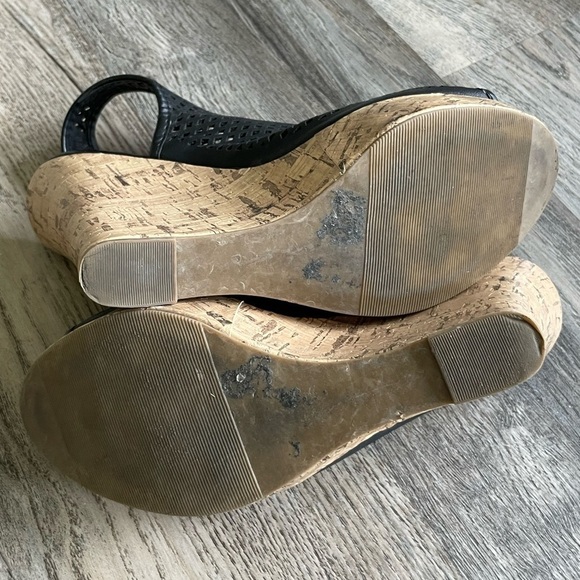 Sbicca Open Toed Black Wedge Sandals, size 8. In good used condition. Wedge is 5” and platform is 1” so overall heel is 4” tall.