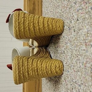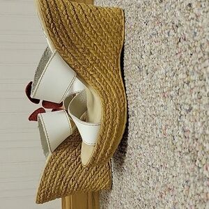 Charming leather wedges with a red floral accent. White straps and woven wedge heel. Sbicca vintage collection, women's sz 8. New without tags or box. 1.25" platform, 4.5" wedge heel