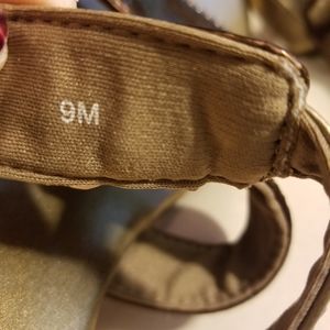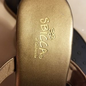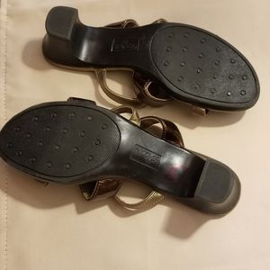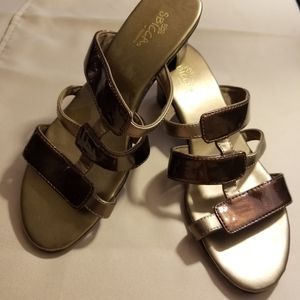 Sbicca slip on brown and gold heels. Three straps across, each strap is brown and gold, the gold is muted not a bright gold color. Approx 2 inch heel. Size 9
