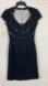 Knee length black dress with cap sleeves, scoop neckline, form-fitting style. Front of dress is solid black fabric with satin ribbon inserts circling around neckline and bodice. Back of dress has black tulle netting with four buttons down the back to waistline and then a hidden zipper from waist down. Fully lined with light boning in the front bodice near bust. Two vents on front of dress at hemline. No fabric tag but fabric is substantial with a light sheen and feels like a knit fabric. Also, price tag says "navy" but this is a black dress.