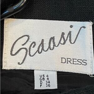 This is a stylish and classic Scaasi little black dress. It is made from 100% linen, making it breathable and comfortable, perfect for warm weather. The dress features short sleeves and a knee-length cut, making it versatile for both casual and more dressed-up occasions. It is a size 4.