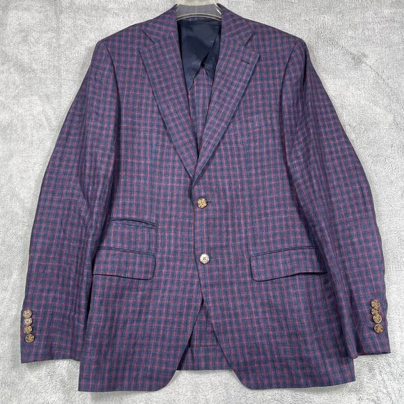 Scabal Blazer Mens 40R 100% Pure Linen Jacket Blue Red Plaid Surgeons Cuffs