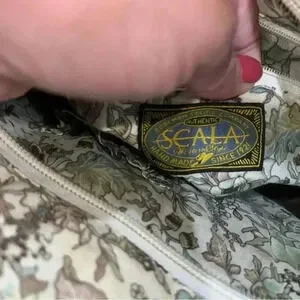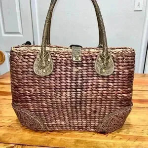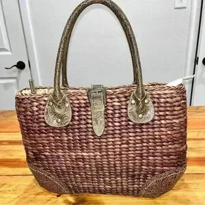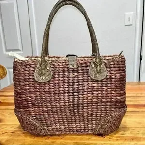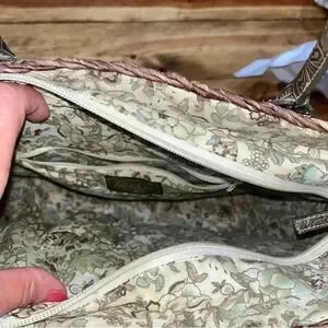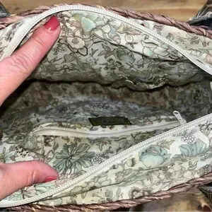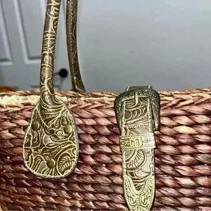 Description: such a cute Maize (Straw) bag with cute floral lined fabric interior. Top zip with a magnetic clasp. Western style tooled faux leather protects the bottom corners and is also used to make interesting handles and flap with small buckle. Perfect for the summer, beach, vacation. Very well made, should hold up for years to come!