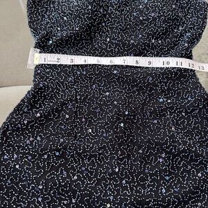 Scala sleeveless halter style dress with black background with blue and silver beads and sequins. Perfect for special occasions. Fastens at the neck in back and shows off back. Flattering both the front and back. See measurements. Worn once and dry cleaned. In ready to wear shape.