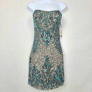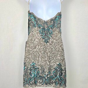 Stunning NWT Scala formal mini dress, style 48528, size 8. Fully hand-beaded and sequined in silver and teal with intricate swirling patterns. Can be worn strapless or with removable straps (included). Comes with original tags and extra beads. Perfect for prom, cocktail events, pageants, or evening wear. Boutique quality; high-shine statement piece.