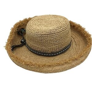 Scala Studio Boho Straw Hat Frayed Brim Woven Patterned Band Detail One Size