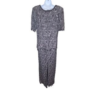 Scala Vintage Gray Beaded Floral Lace Sheath Formal Maxi Dress Gown Size 1x