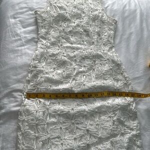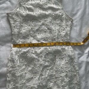 This stunning Scala dress features a sleeveless halter neckline and a sheath silhouette, adorned with intricate sequin embellishments that shimmer beautifully. The white and beads dress make it an ideal choice for a bride or wedding guest, exuding elegance and sophistication.