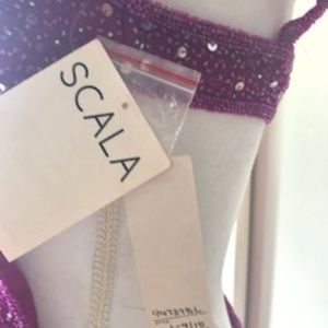 Never worn Scala sequin long dress. Dress has a side split, open back with one strap across the back. All sequins are in tack. Dress is in excellent condition. Tags still on dress. Extra sequins also attached. Tags say size 9/10. However dress runs small.