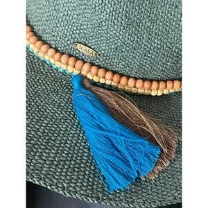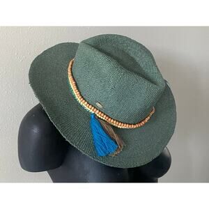 This is a Scala Women's Beaded Band Safari Fedora Hat with Tassels in Green Natural Woven Style is One Size. Perfect for any Boho, Festival, Southwestern, Rodeo, Casual, or Sun Hat aesthetic.