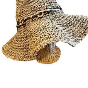 This women's floppy, wide-brim hat is crafted from straw and comes in a solid brown color. It features a beaded accent and offers sun protection, making it both fashionable and functional for casual occasions. The hat embodies a boho theme and is designed in one size to fit most. It is pre-owned.