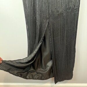 Back zipper, back bottom slit, lightly padded shoulders, dress is lined.  Measurements are provided in the photos.