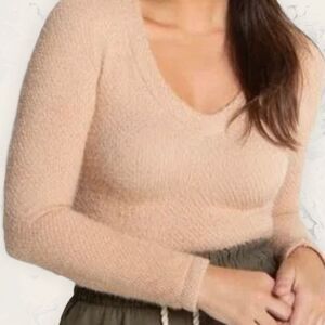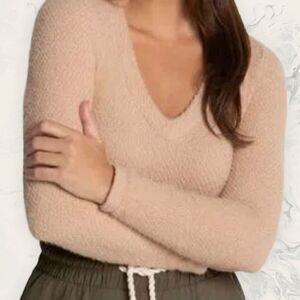 Long-sleeved V-neck blouse. Knitted feels like CASHMERE TOUCH. SEAMLESS TECHNOLOGY that unites the combination of yarns with the closed mesh KEEPING THE BODY TEMPERATURE WARM. Composition: 99% Polyamide, 1% Elastane