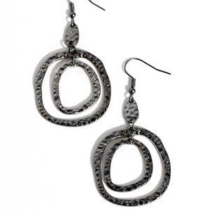 Hammered in shimmery textures, a pair of asymmetrical gunmetal hoops cascade from the bottom of a matching hammered fitting for an edgy vibe. Earring attaches to a standard fishhook fitting.