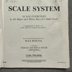 This is a Scale System Scale Exercises in All Major and Minor Keys for Daily Study, A supplement to Book 1 of The Art of Violin Playing. Revised and Englared Edition by Max Rostal, 1987.