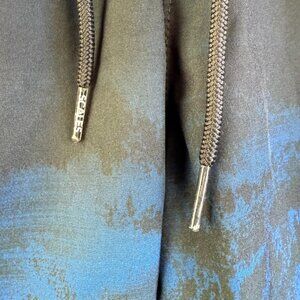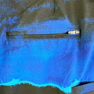 • Performance hybrid boardshorts in blue and black abstract scales print.
