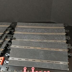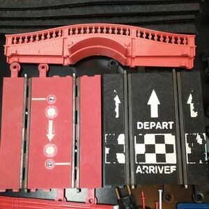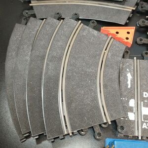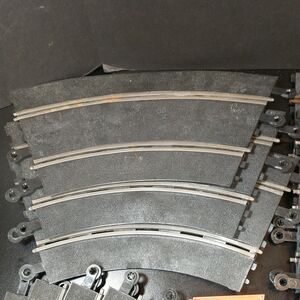 There are 4 straight tracks, 4 curved tracks and 3 curved/bent tracks. Comes with the 220v transformer, 2 controllers, 2 Porsche Carrera Turbo's, tracks, 5 guard rails, 2 bridge humps and 2 small plastic pieces, one red and one green.
