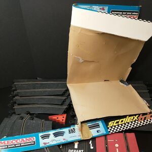 Scalextric Vintage Slot Car Racing Set 2 Porsche Carreras Tri-ang Made in France. Untested condition. Sold as is. The set is almost complete, please see picture #11. The box cover is ripped and folded in multiple spots. The wheels on the cars have dry rotted and split.