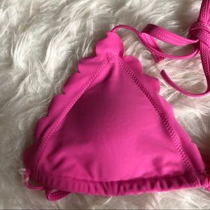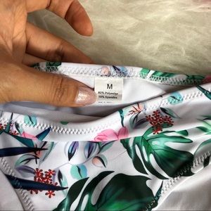 Scalloped trims bikini top with tropical print bottoms. Worn once for a trip for pictures. In good condition. Top left side one scallop has a small notch, but it was already like it when I bought them. Didn't even notice until I took these flat image.