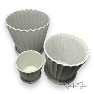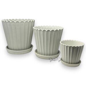 2pc Large Scallop-Fluted Stoneware Outdoor Planter Pot with Saucer Cream