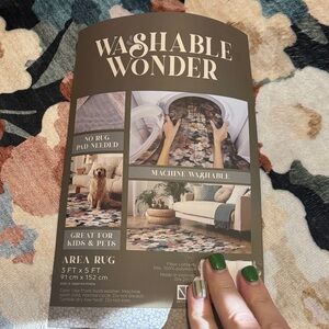 Scalloped edge floral accent rug. Features soft blooms in cream, dusty blue, blush, tan and black accents. Subtle watercolor-inspired print for a cozy, feminine touch. Washable rug. Has never been used. Right out of the box. Slightly bigger than your average 3” x 5” rug due to scalloped edge.