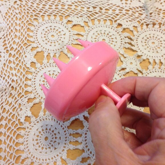 New without tags scalp massager in pink. I brought several of these and kept one for myself. I really like it when I wash my hair. It feels good on my scalp. The part you hold is hard plastic but the pointed massage points feel like rubber or silicone and are somewhat flexible.