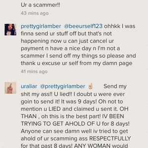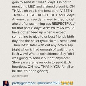 This girl is a scammer!! Bought it for my best friends birthday and she lied that she sent it . now its been 9 days! Nothing! Then says she was going to send it, coincidently after i got fed up and told her shes a scammer thanks for nothing, after 9 DAYS and blocks me. Iv tried to contact her for the past 9 days and nothing but lies!! Than when I confront her with another account showed damn well that she was the scammer i new she was! Petty!
