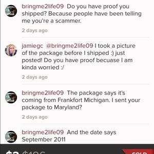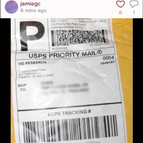 Beware of this user. She claims she sent items to myself and others but none of us received them. She told me there was a storm so the package is delayed and then she had no printer so she had to buy a label. Then she posted this picture which she deleted which is dated September 12,2011!!!!!! And it's coming from Michigan not Maryland where she is from. I had to call usps and spend money just to get my package back. BEWARE. And she blocked me after confronting her.