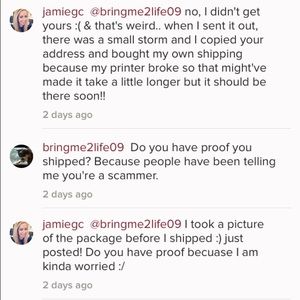 @bringme2life09 pretty much, if she does the whole proof thing and we do end up trading, I'm gonna wait to receive the package from her before I ship